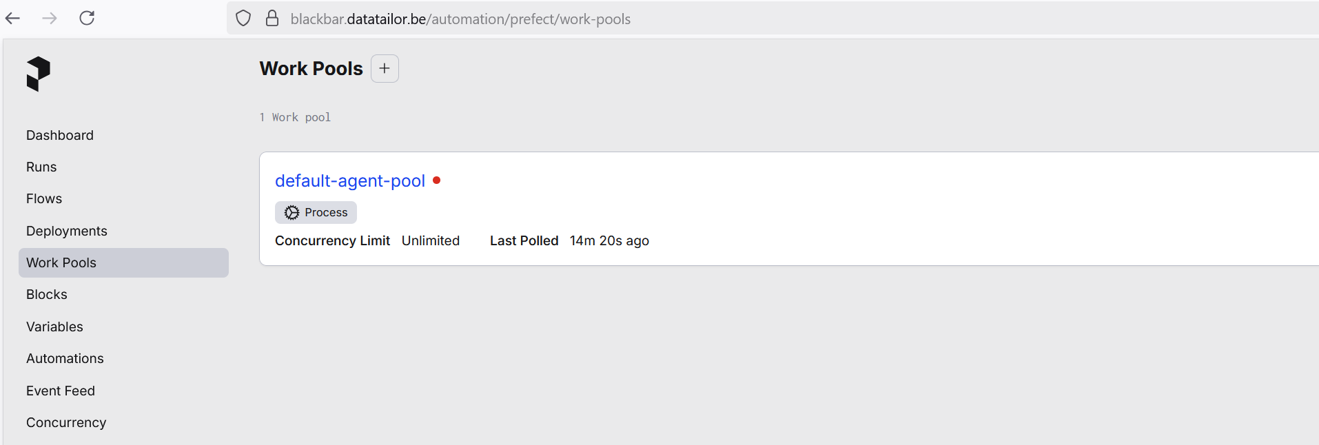PREFECT_WORKPOOL=default-agent-poolFor this to work. In the Prefect UI at your site e.g. https://blackbar.datatailor.be/automation/prefect/, create a process workpool with a name that you choose e.g. default-agent-pool.